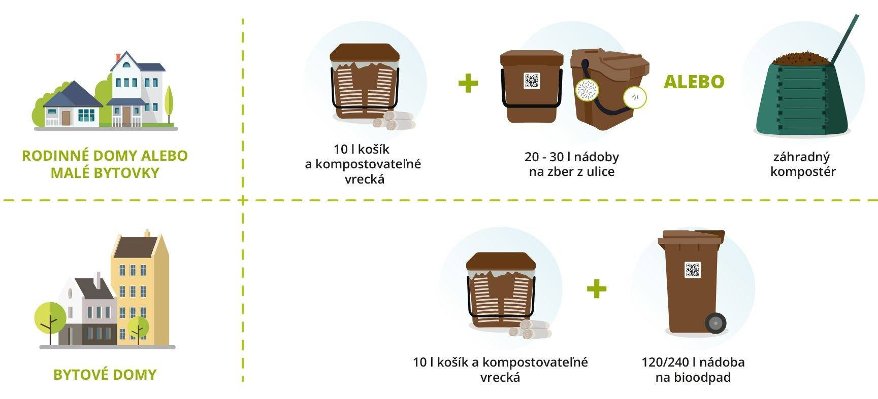 - väčšina samospráv zabezpečila pre svojich občanov malé zberné nádoby z recyklovaného materiálu, spolu s recyklovateľnými sáčkami. Tieto majú občania v domácnosti, kde zbierajú odpad a následne s recyklovaným (pozor recyklovaný sáčok je možné dávať do zberu, nesmú sa používať klasické igelitové sáčky!!) sáčkom vyhadzujú do pripravených nádob na kuchynský odpad. Tento následne zbiera a odváža spoločnosť na to určená. Kuchynský odpad sa následne odváža do bioplynovej stanice.